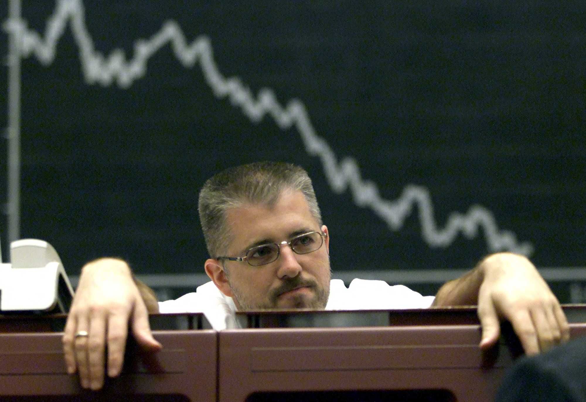 A broker is seen under the board of the DAX (German stock market index) at Frankfurt's stock exchange September 10, 2001.