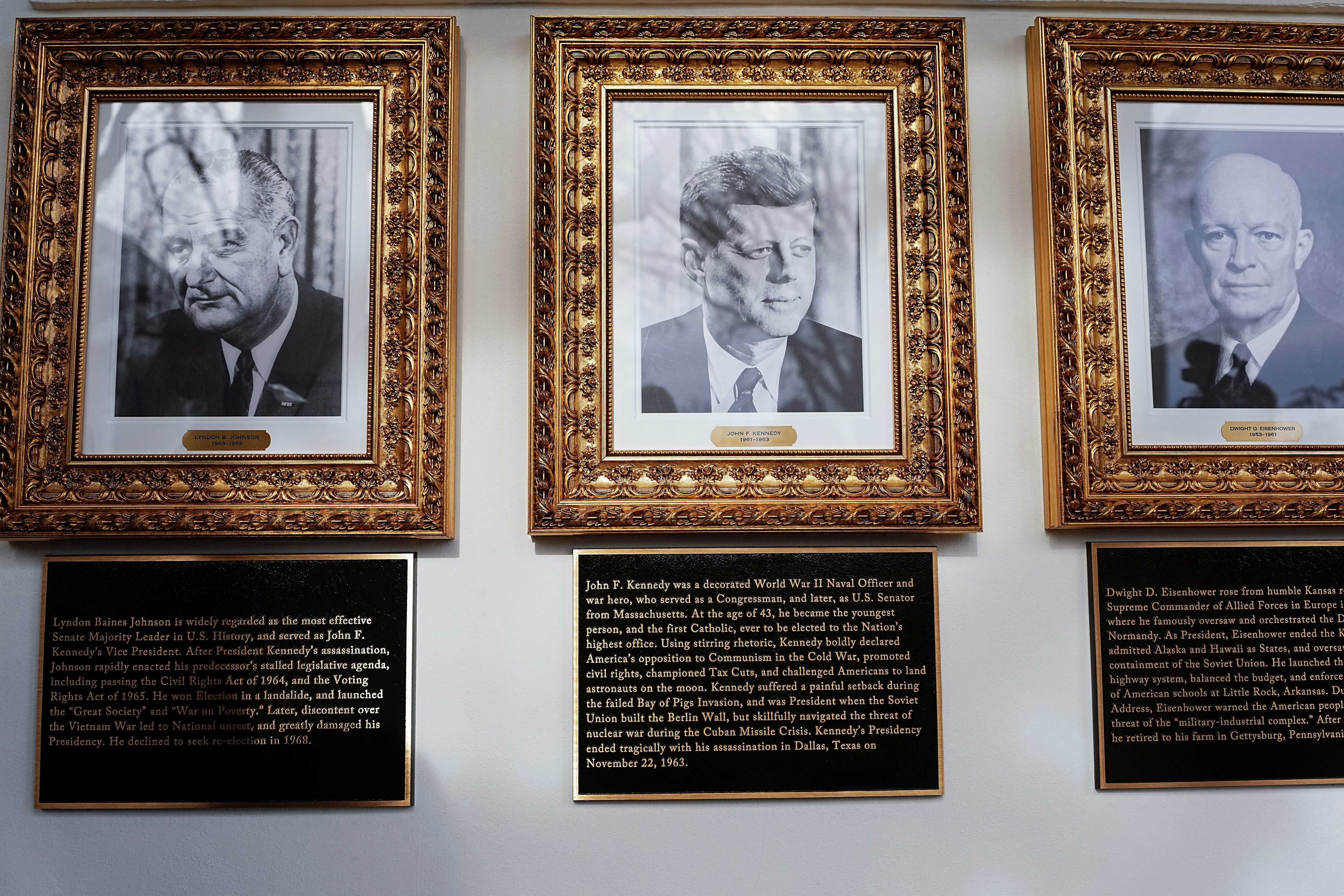 Portraits and plaques dedicated to former U.S. Presidents Lyndon B. Johnson, John F. Kennedy and Dwight D. Eisenhower at the "Presidential Walk of Fame" at the White House, in Washington, D.C., U.S., December 17, 2025. REUTERS/Aaron Schwartz
