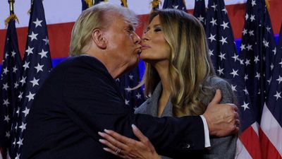 Donald Trump kisses his wife Melania at his rally at the Palm Beach County Convention Center in West Palm Beach, Florida, U.S., November 6, 2024. REUTERS/Brian Snyder