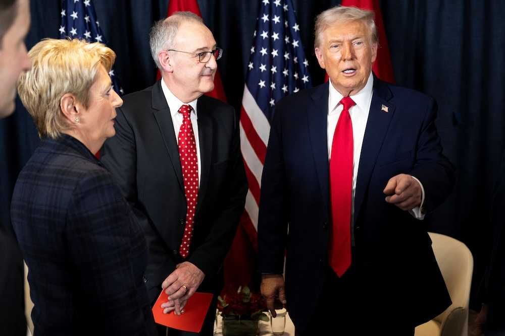 U.S. President Donald Trump speaks next to Switzerland's Federal President Guy Parmelin and Switzerland's Economy Minister Federal councillor Karin Keller-Sutter in Davos, Switzerland, January 21, 2026. Laurent Gillieron/Pool via REUTERS