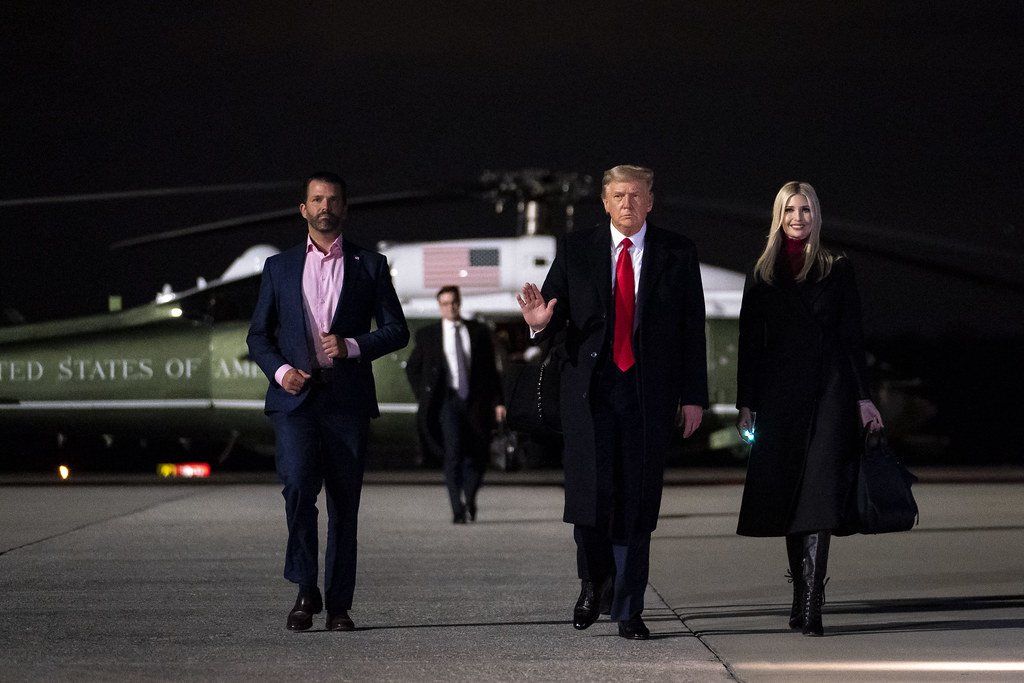 President Donald J. Trump walks with Presidential Advisor Ivanka Trump and his son Donald J. Trump Jr. to board Air Force One at Dobbins Air Reserve Base in Marietta, Ga. Tuesday, Jan. 4, 2021, for their return flight to Joint Base Andrews, Md. (Official White House Photo by Tia Dufour)