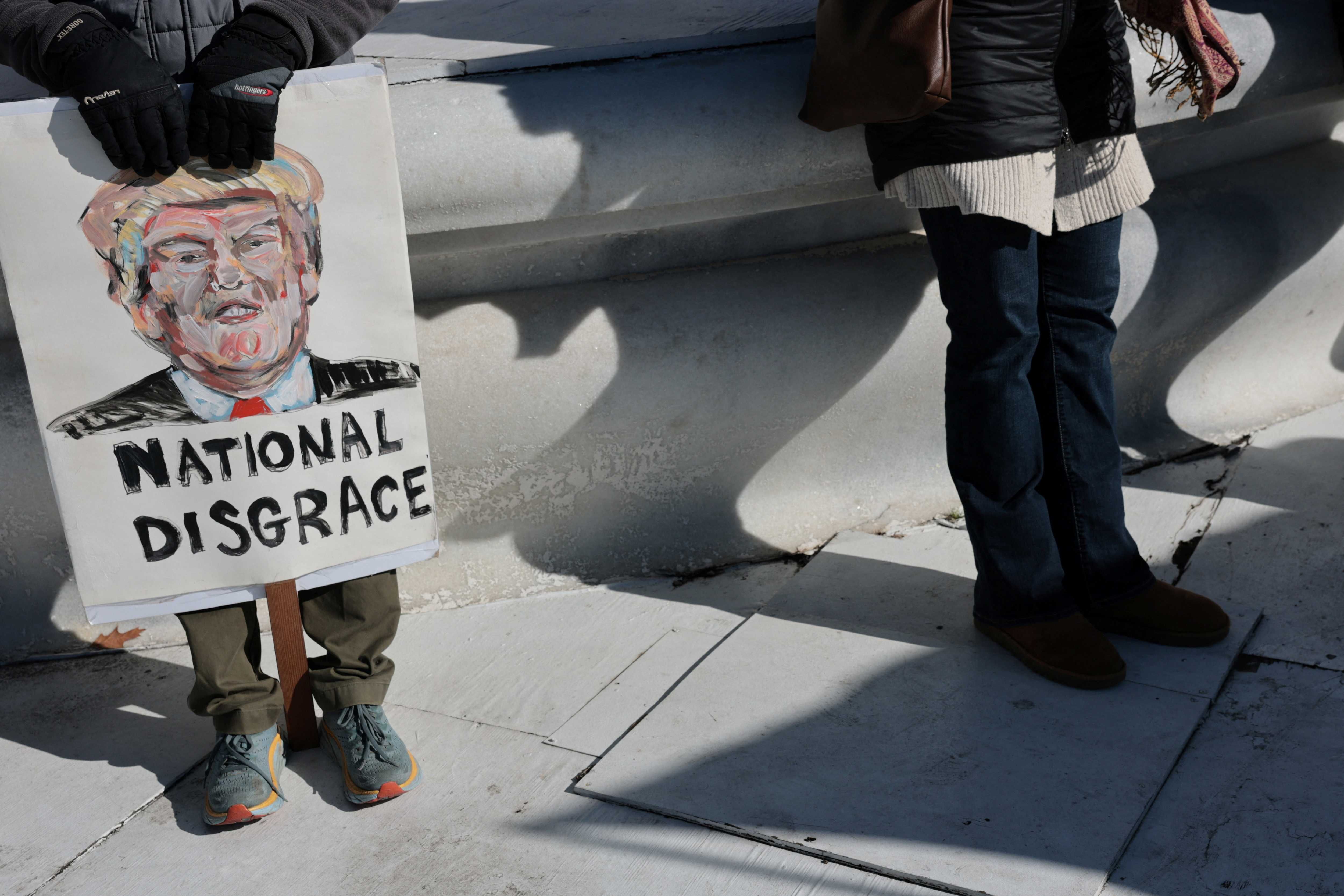 An attendee holds an anti-Trump sign as veterans rally against federal cuts, immigration policies, and other programs under U.S. President Donald Trump’s administration during a Veterans Day protest at Union Station on Capitol Hill in Washington, D.C., U.S., November 11, 2025. REUTERS/Jonathan Ernst