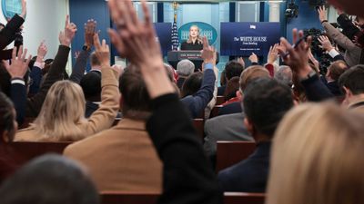 Hands are raised as White House press secretary Karoline Leavitt holds a press briefing at the White House, in Washington, D.C., U.S., December 11, 2025. REUTERS/Jonathan Ernst