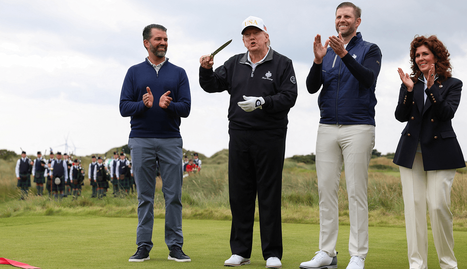 U.S. President Donald Trump holds scissors next to Eric Trump and Donald Trump Jr. in Balmedie, Aberdeen, Scotland, Britain, July 29, 2025. REUTERS/Evelyn Hockstein