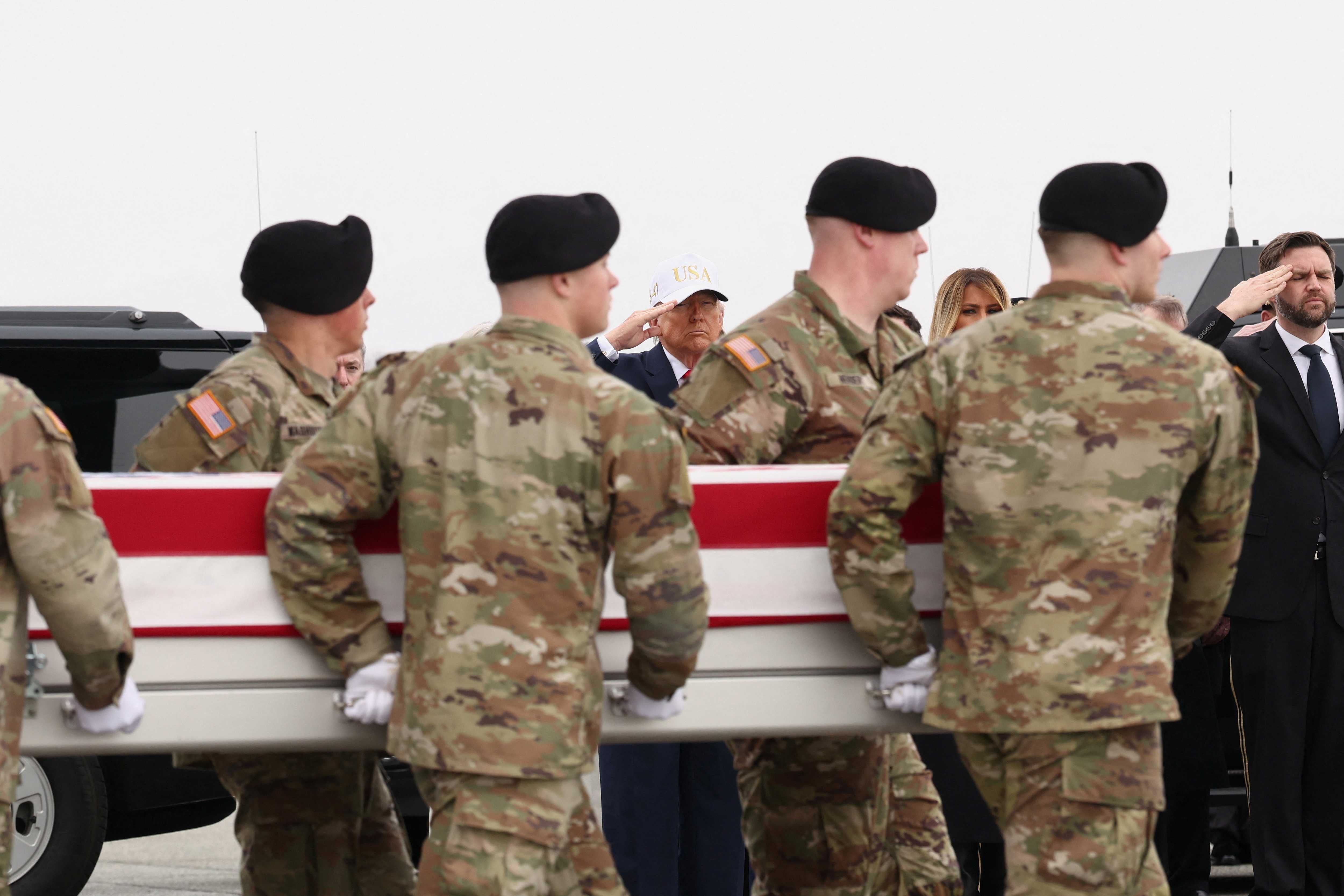 U.S. President Donald Trump, U.S. first lady Melania Trump, and U.S. Vice President JD Vance stand as members of military carry a transfer case during a dignified transfer of the remains of six U.S. Army service members.