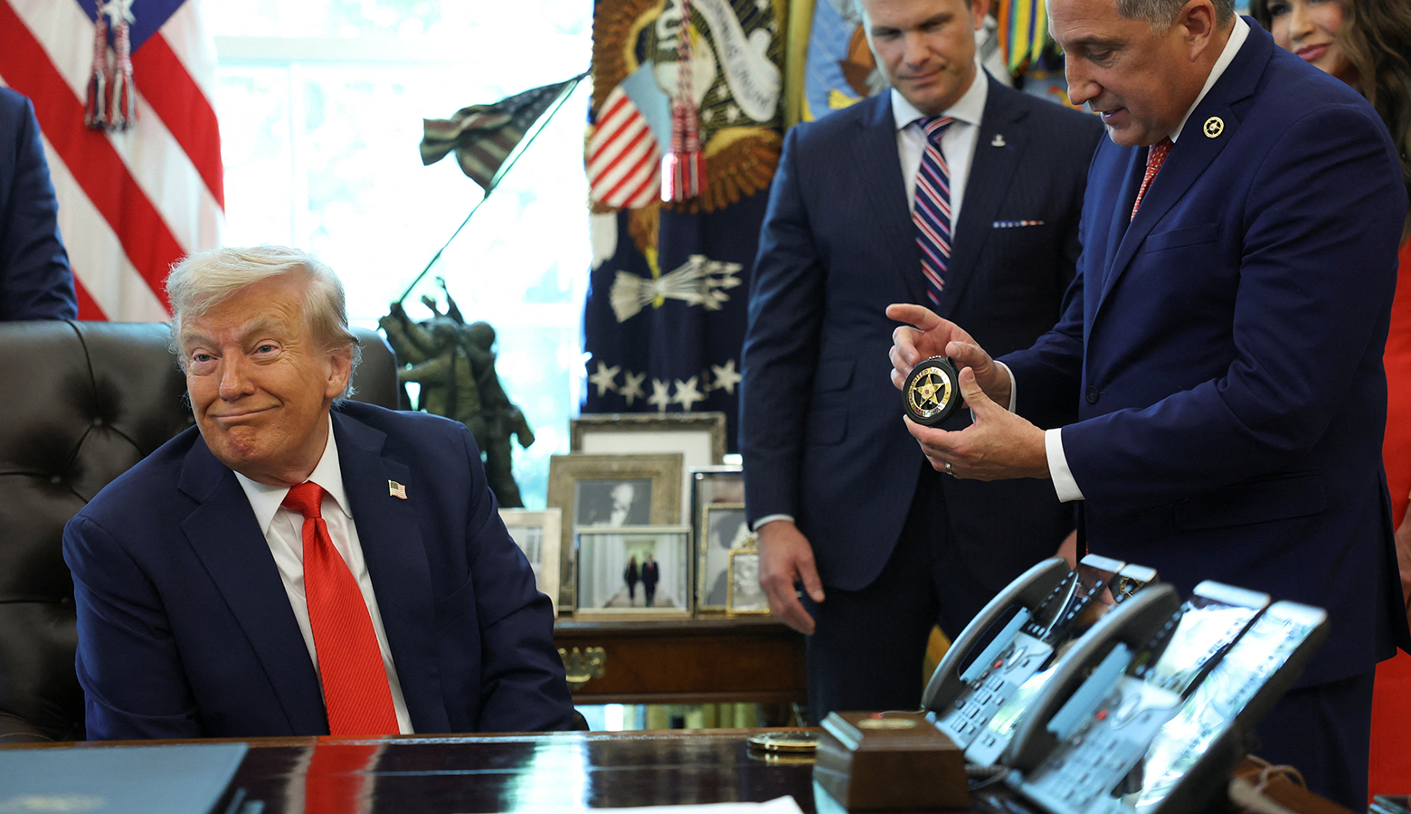 U.S. President Donald Trump reacts as U.S. Marshals Service Director Gadyaces Serralta presents him with a badge during the signing of executive orders in the Oval Office at the White House in Washington, D.C., U.S., August 25, 2025. REUTERS/Jonathan Ernst