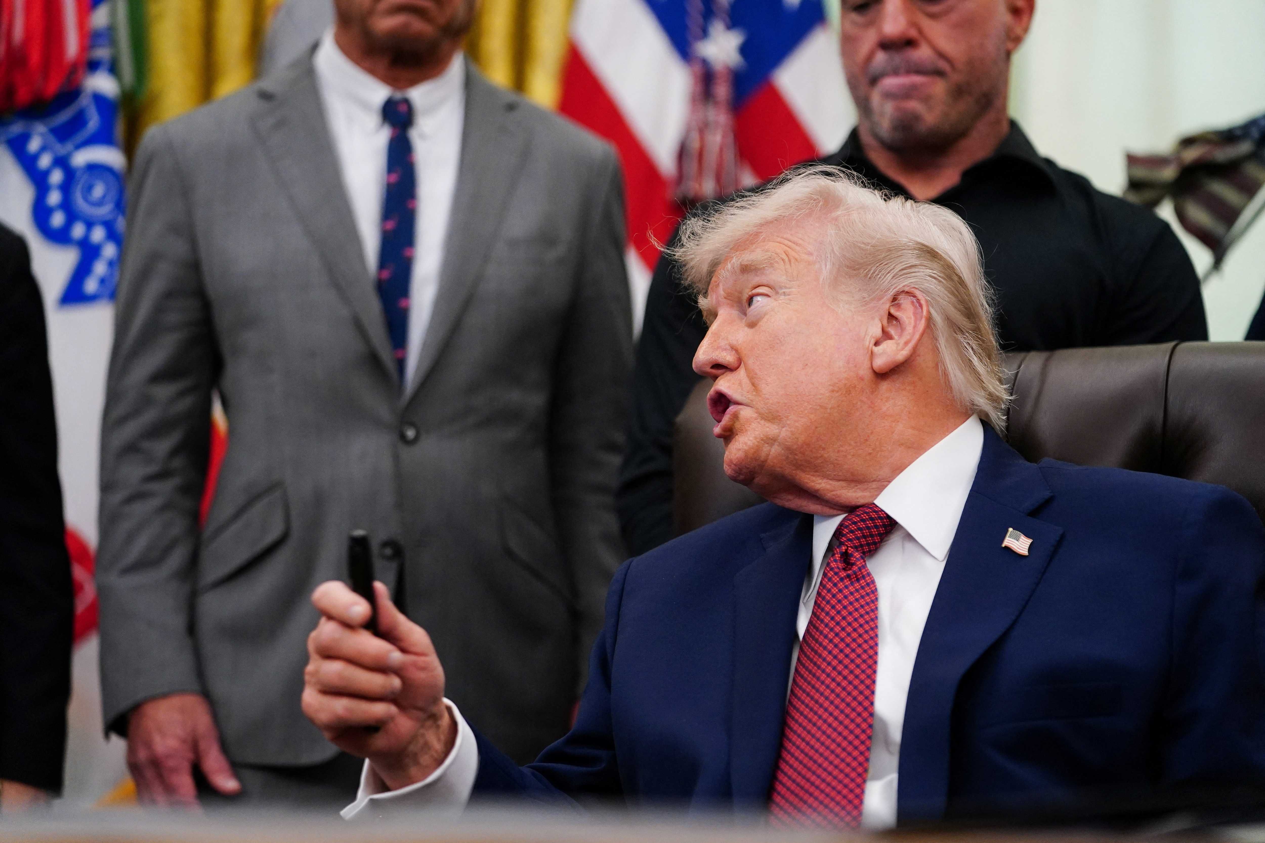 U.S. President Donald Trump holds a pen, on the day he signs an executive order about easing restrictions on mental health treatments, including, ibogaine, in the Oval Office of the White House in Washington, D.C., April 18, 2026. REUTERS/Nathan Howard
