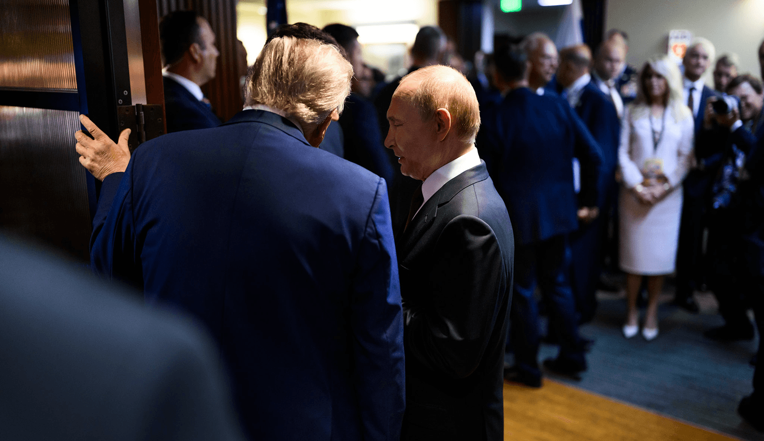 President Donald Trump and Russian president Vladimir Putin speak backstage after they held a joint press conference after their meeting at the Arctic Warrior Event Center at Joint Base Elmendorf Richardson in Anchorage, Alaska, Friday, August 15, 2025. (Official White House Photo by Daniel Torok)