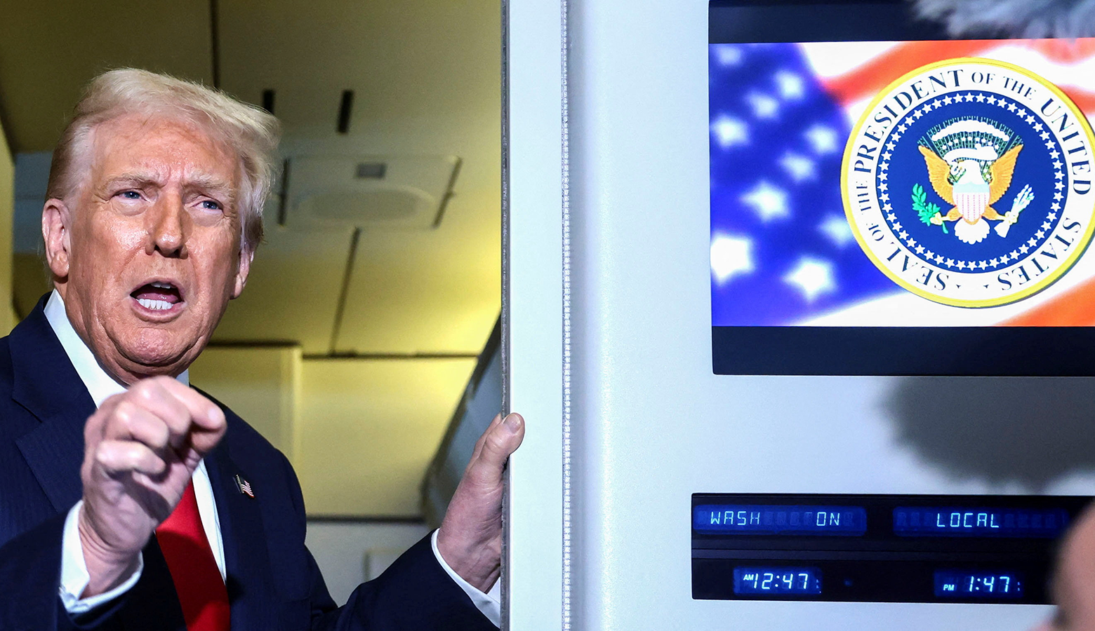 U.S. President Donald Trump speaks to members of the media aboard Air Force One en route to the United States, October 30, 2025. REUTERS/Evelyn Hockstein