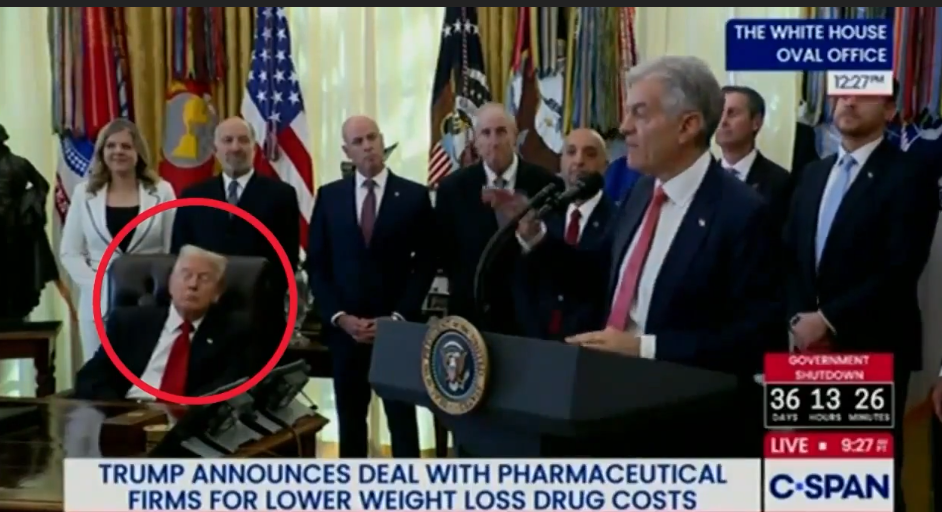 Before a man fainted in the Oval Office where the administration was announcing price cuts for weight-loss drugs, President Donald Trump struggled to stay awake for 20 minutes in a now-viral photo that the Washington Posthas analyzed via video.