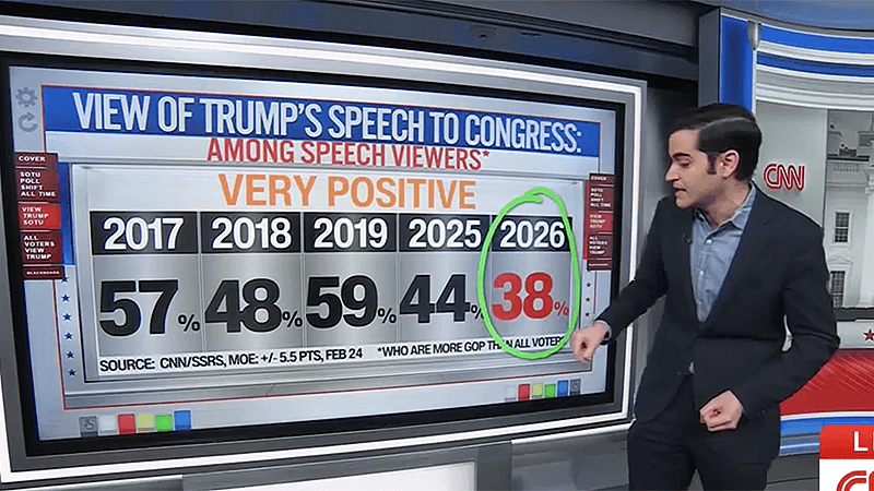 "We're talking about 38 percent of speech viewers who viewed the speech very positively, and that is lower than in 2025, when it was 44 percent, lower than in 2019, when it was 59 percent lower than in 2018, when it was 48 percent, and lower than it was in 2017, when it was 57 percent. The bottom line is this: State of the Union addresses, simply put, do not move — traditionally speaking, the American electorate and this Trump speech especially so, is not likely to move things," he said.