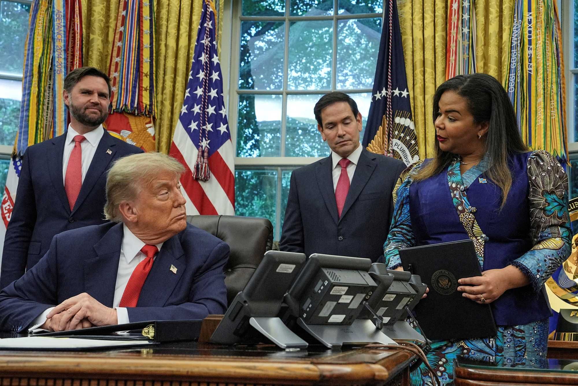 U.S. President Donald Trump, Secretary of State Marco Rubio and Vice President JD Vance with Democratic Republic of the Congo's Foreign Minister Therese Kayikwamba in the White House Oval Office, June 27, 2025. REUTERS/Ken Cedeno