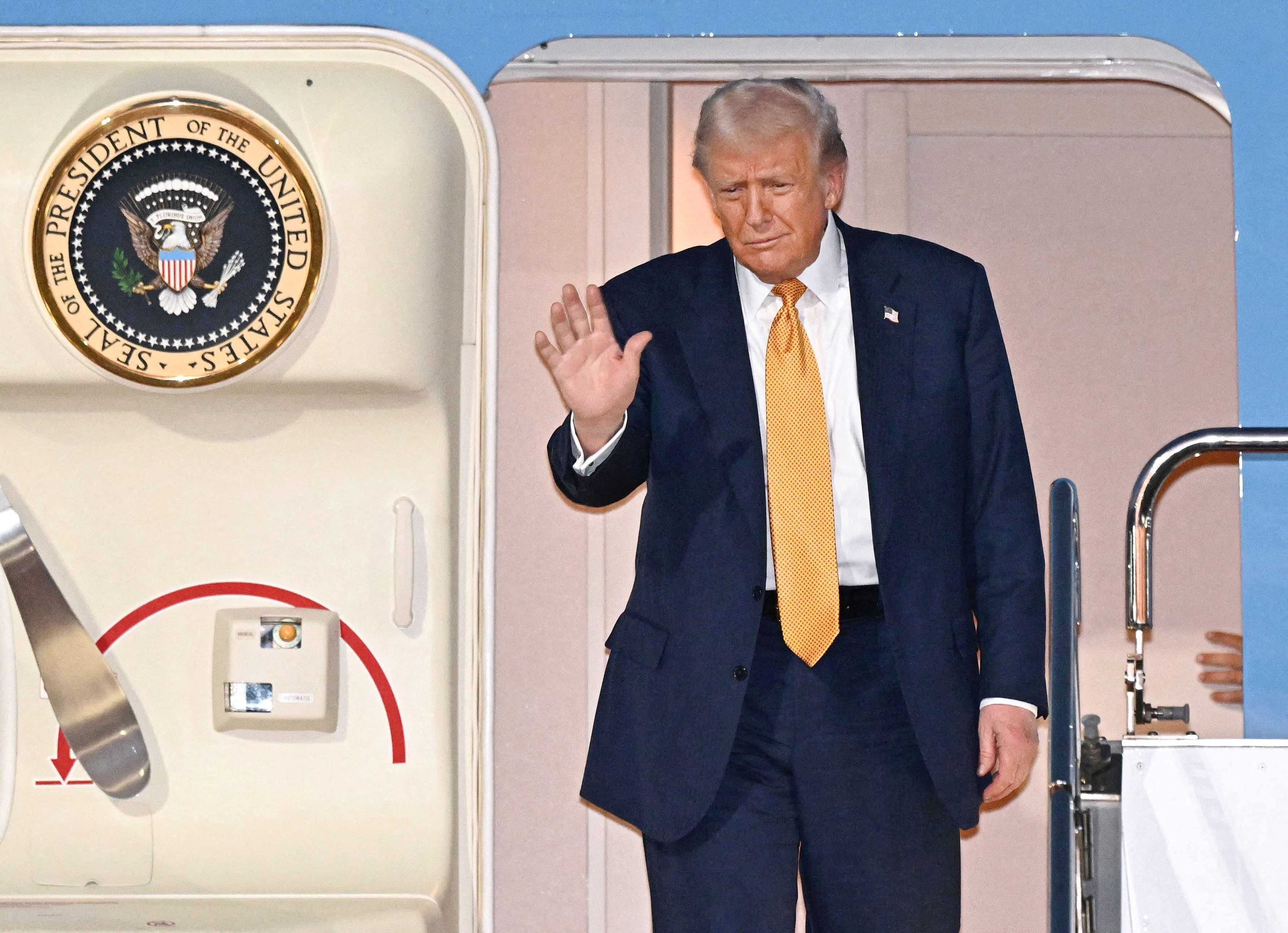 U.S. President Donald Trump waves upon his arrival at Haneda airport in Tokyo, Japan, in this photo released by Kyodo October 27, 2025. Mandatory credit Kyodo/via REUTERS