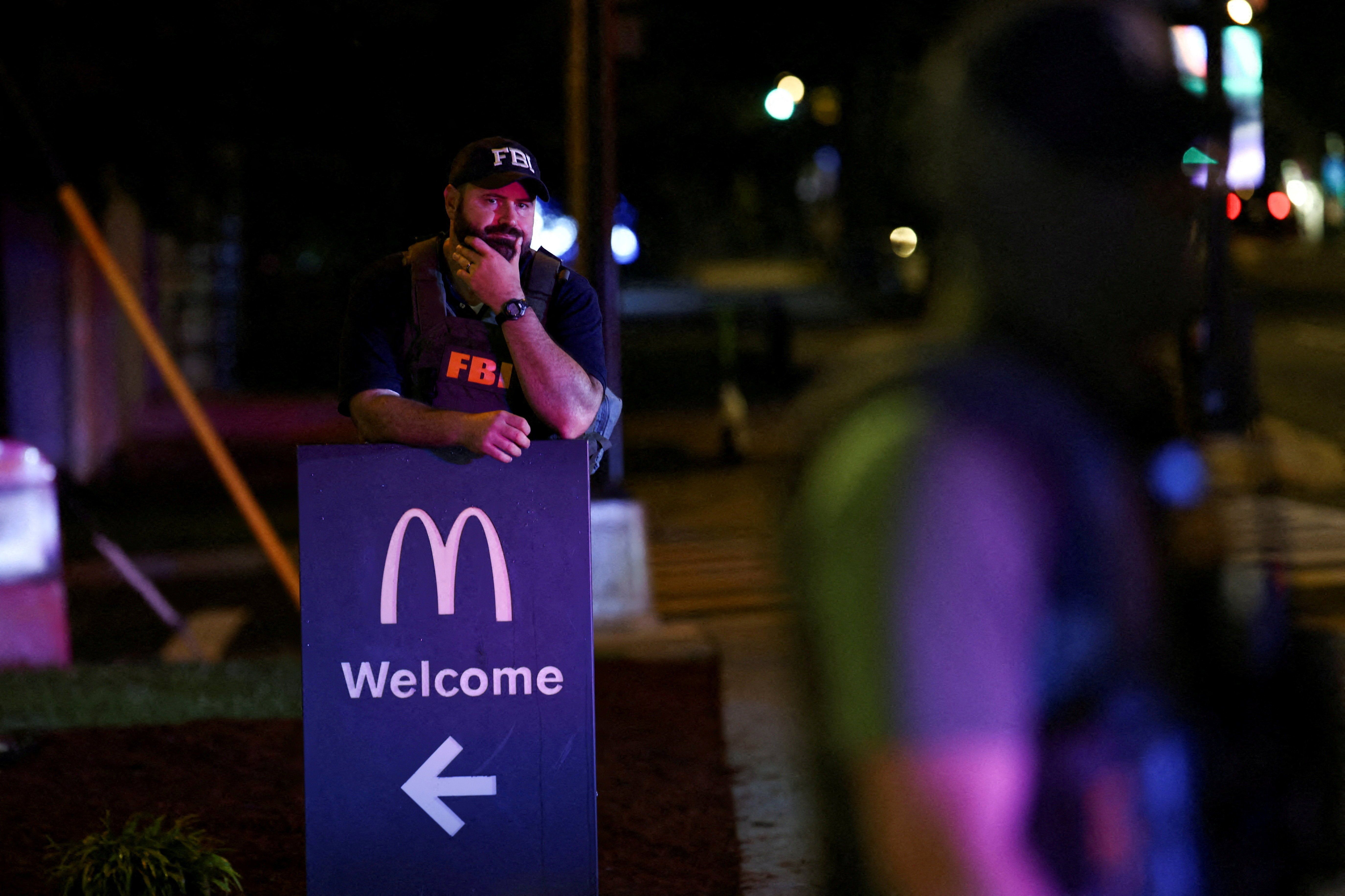 A member of the FBI leans on a McDonald's welcome sign near the site where police were detaining a person for driving without a license at Brightwood neighborhood after U.S. President Donald Trump's announcement of the federal takeover of the Metropolitan Police Department, August 14, 2025. REUTERS/Evelyn Hockstein