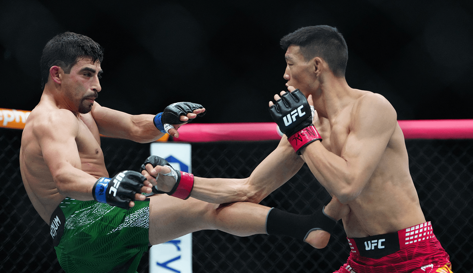 Mar 7, 2026; Las Vegas, Nevada, UNITED STATES; Sumudaerji (red gloves) fights Jesus Aguilar (blue gloves) during UFC 326 at T-Mobile Arena. Mandatory Credit: Stephen R. Sylvanie-Imagn Images