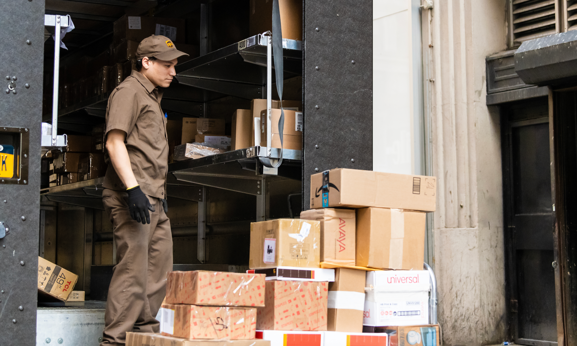 A United Parcel Service (UPS) driver unloading packages in Manhattan, New York City on April 6, 2018 (Image: Shutterstock)