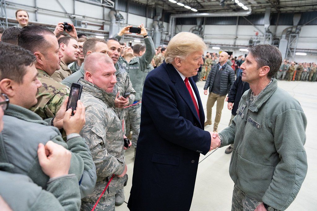 President Donald J. Trump shakes hands and takes photos with military personnel during a stop-over at Ramstein Air Force Base in Germany Wednesday evening, December 26, 2018, following his unannounced visit to U.S. troops at the Al-Asad Airbase in Iraq. (Official White House Photo by Shealah Craighead)