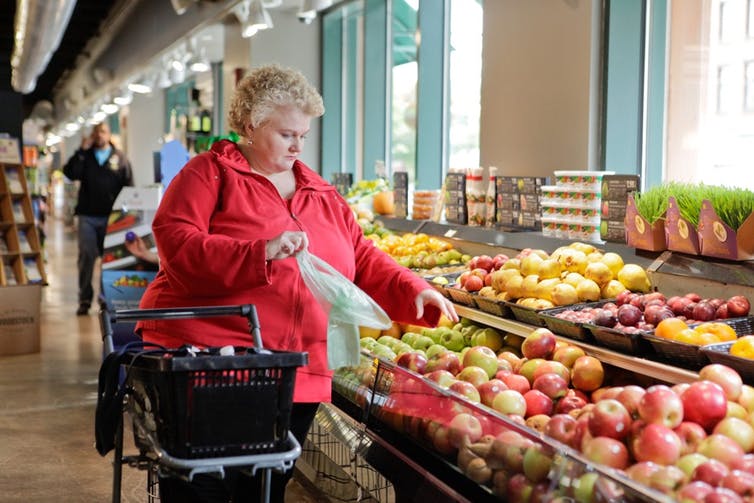 A woman shopping in the produce department of a grocery store. People who are overweight often must learn to like healthy foods.UConn Rudd Center for Food Policy and Obesity, CC BY-SA