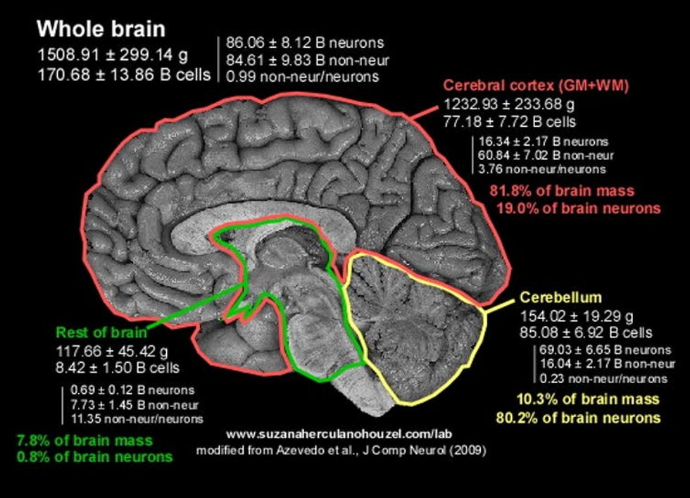 Neuroscientists did have a rough idea. Some estimates suggested 10 to 20 billion neurons for the human cerebral cortex, others some 60 to 80 billion in another region called the cerebellum. With the rest of the brain known to be fairly sparse in comparison, the number of neurons in the whole human brain was definitely closer to 100 billion than to just 10 billion (far too little) or 1 trillion (way too many).