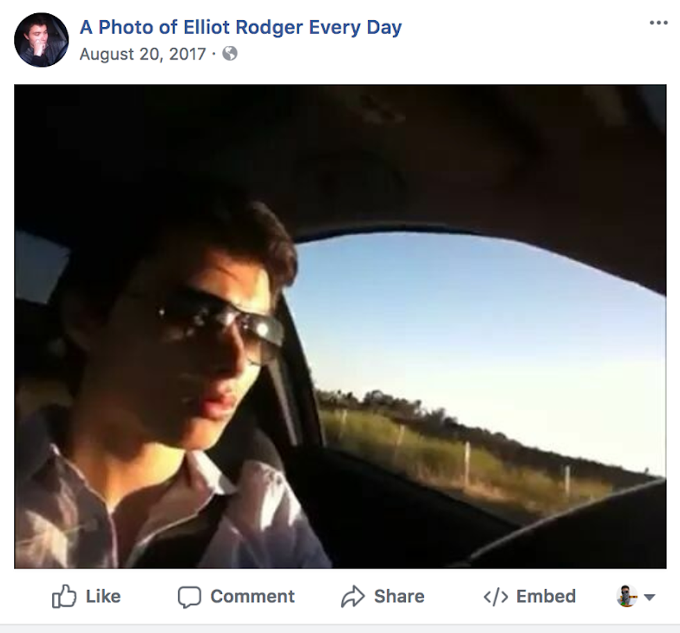 A page prominently featuring a picture of Rodger wearing fashionable sunglasses, calling itself Would you fuck Elliot Rodgers? remained active on the site, as did a page called Feminism must be destroyed, which approvingly cites Rodger’s killing spree as an attack on feminism itself.