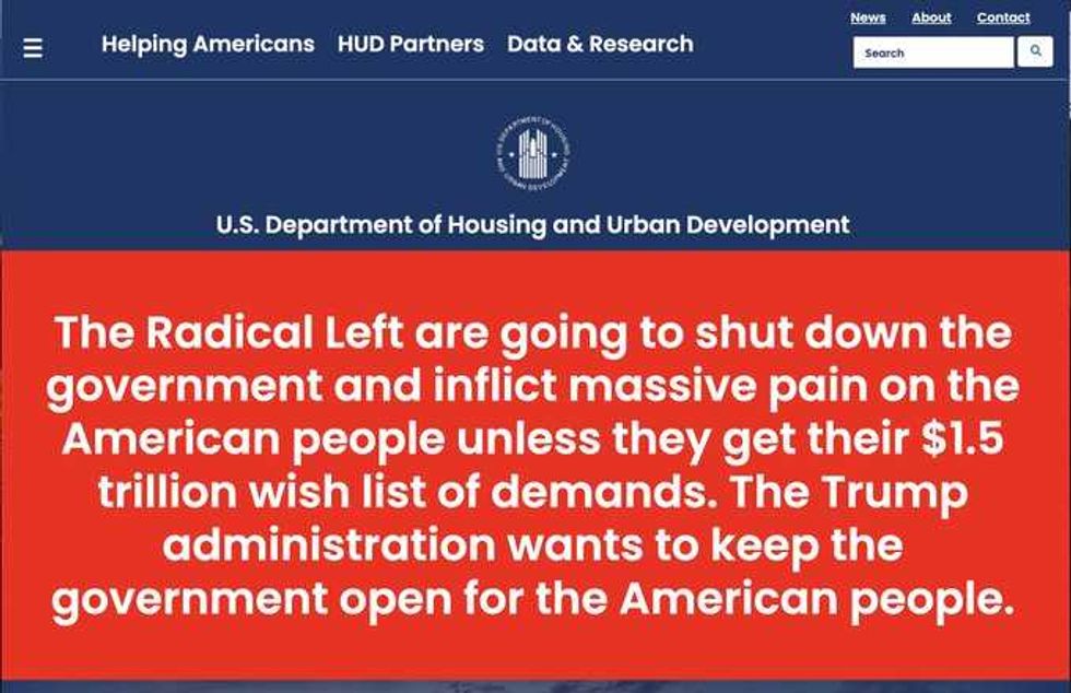 HUD.gov now opens with a wide pop-up notification that reads, "The Radical Left are going to shut down the government and inflict massive pain on the American people unless they get their $1.5 trillion wish list of demands. The Trump administration wants to keep the government open for the American people."