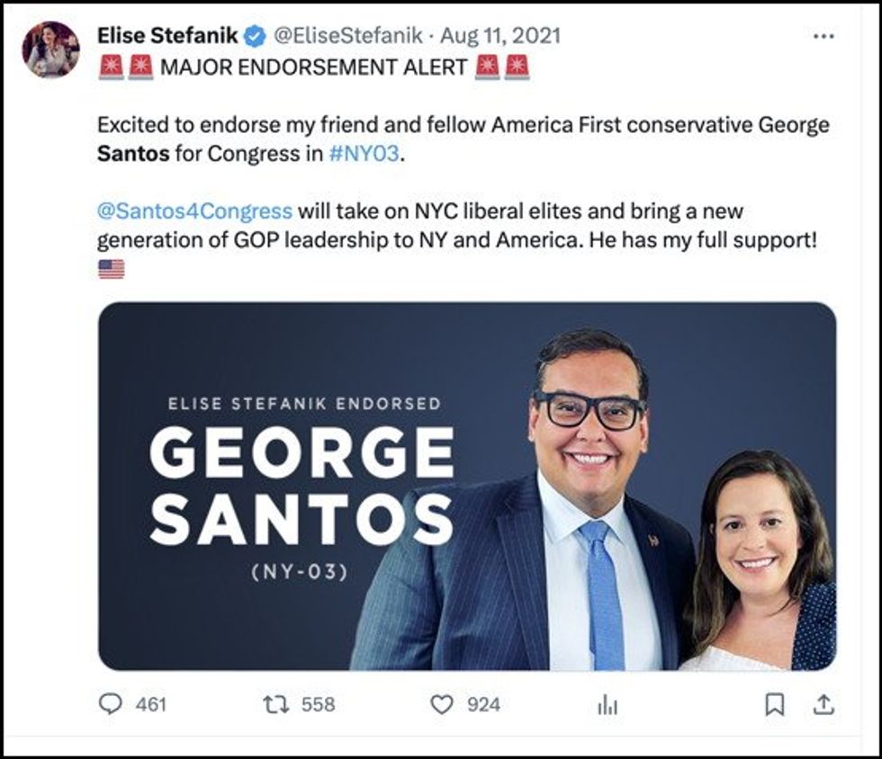 And while House Republican Speaker Mike Johnson’s office issued a statement calling the Ethics Committee’s report “troubling,” as Punchbowl News reports, it’s been crickets from the Speaker himself, and even less from his House GOP leadership team, including Majority Leader Steve Scalise, Majority Whip Tom Emmer, and most notably, Republican Conference Chair Elise Stefanik, who not only strongly endorsed Santos, she reportedly was “laser-focused” on getting him elected and even fundraised for her fellow New York Republican.