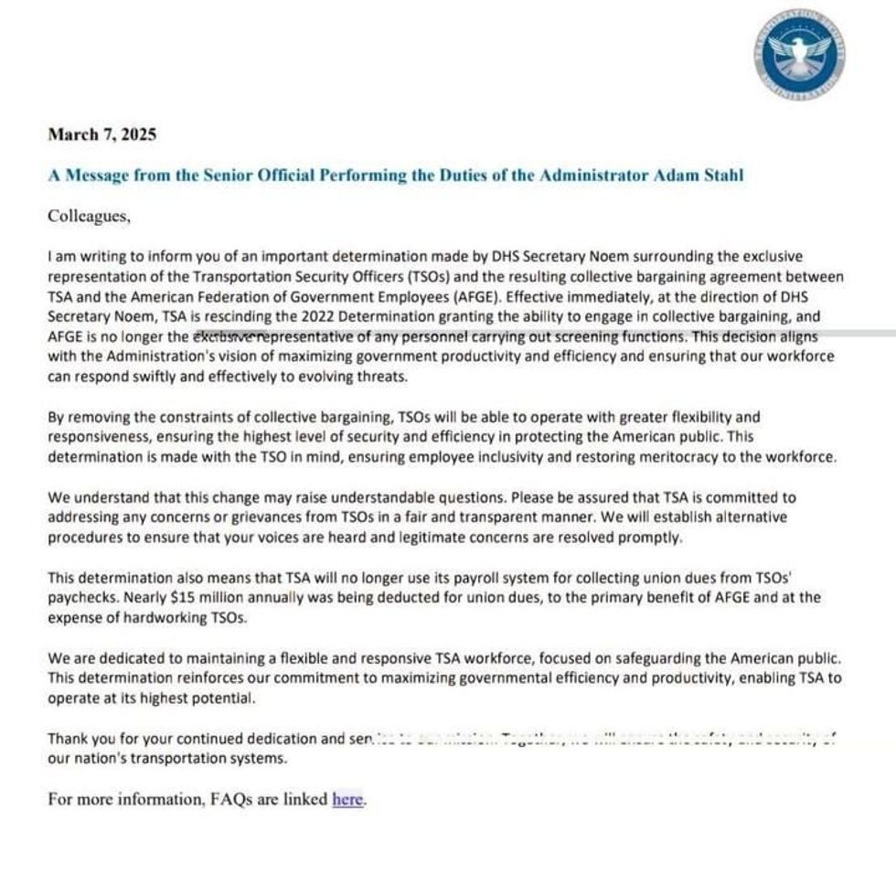 "Through a union, TSA officers are empowered to improve work conditions and make air travel safer for passengers," Shuler added. "With this sweeping, illegal directive, the Trump administration is retaliating against unions for challenging its unlawful Department of Government Efficiency actions against America's federal workers in court."