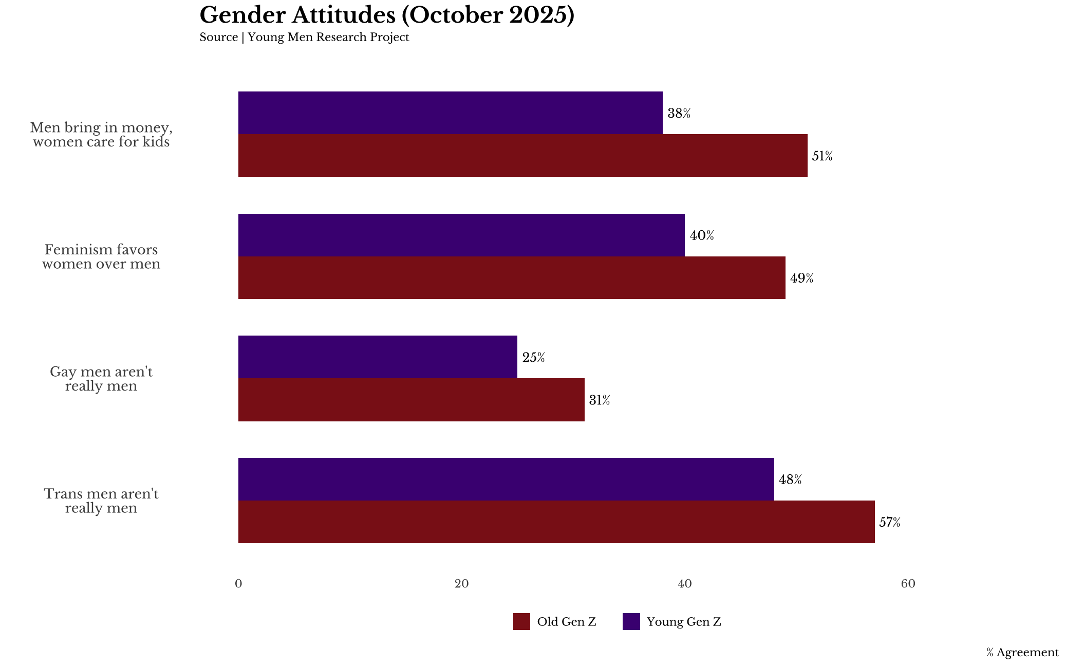 The cultural shift is notable as well. Young Gen. Z men reject the idea of a "Trad Wife" staying home while they're the breadwinners. A whopping 62 percent are against it. Older Gen. Z men oppose it as well, but only by a slim majority (51 percent).